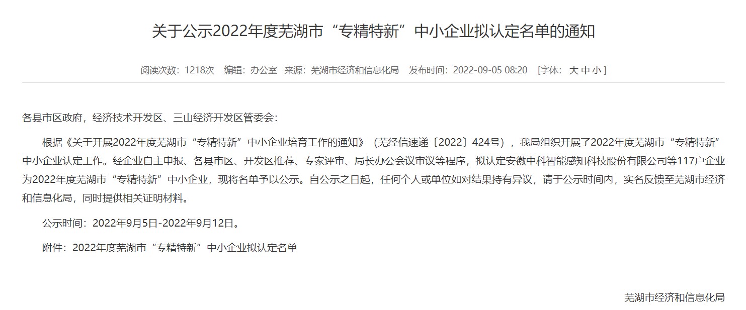 9月5日,蕪湖市經(jīng)信局公布了 2022年度蕪湖市“專精特新”中小企業(yè)認(rèn)定名單,經(jīng)過7天的公示期,安徽云圖信息技術(shù)有限公司等117家企業(yè)被認(rèn)定為2022年度蕪湖市“專精特新”中小企業(yè)。