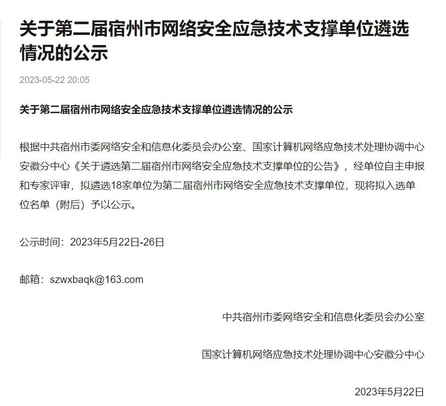 ? ? ? ? ?近日,中國宿州市網(wǎng)絡安全和信息化委員會辦公室、國家計算機網(wǎng)絡應急技術處理協(xié)調(diào)中心安徽分中心發(fā)布了第二屆宿州市網(wǎng)絡安全應急技術支撐單位遴選情況,安徽云圖成功入選。
