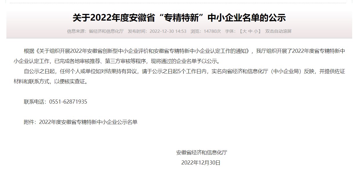 ? ? ? ? ?近日,安徽省經(jīng)信廳公布了2022年安徽省“專精特新”中小企業(yè)名單。安徽云圖成功通過(guò)審核,被認(rèn)定為安徽省“專精特新”中小企業(yè)!